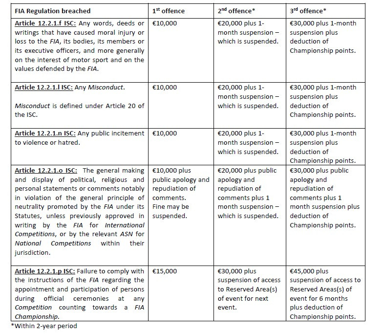 The first offence is Є10,000 plus a public apology and repudiation of comments with the chance of the fine being suspended. The second offence is Є20,000 plus a public apology and repudiation of comments plus a one month ban which is suspended. Finally, the third offence is Є30,000 plus a public apology and repudiation of comments plus a one month suspension and a deductions of Championship points.